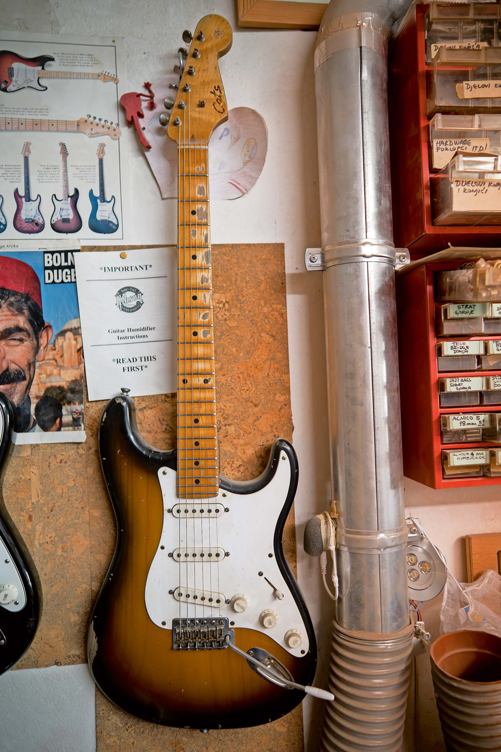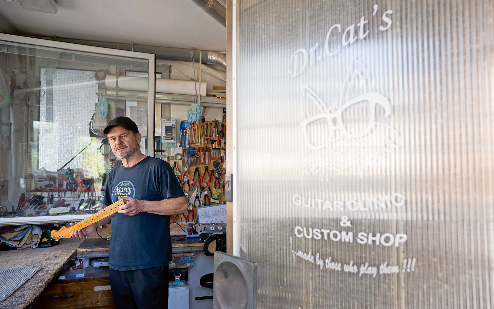 Da Matijeviću doista ne treba nikakva reklama, odnosno da mu je najbolja reklama njegov rad, uvjerio sam se odmah u trenutku kada sam došao pred njegov “ured”. Naravno, kvaka je u tome da nema nikakvog ureda, nego u prizemlju obiteljske kuće stoji radionica koju je, ako ne znate kamo idete, poprilično lagano promašiti, jer ispred nje nema nikakvih znakova, uputa ili nečeg trećeg. Tek se na metalno-staklenim ulaznim vratima nalazi naljepnica: “Cats – Guitar Custom & Repair Shop”.