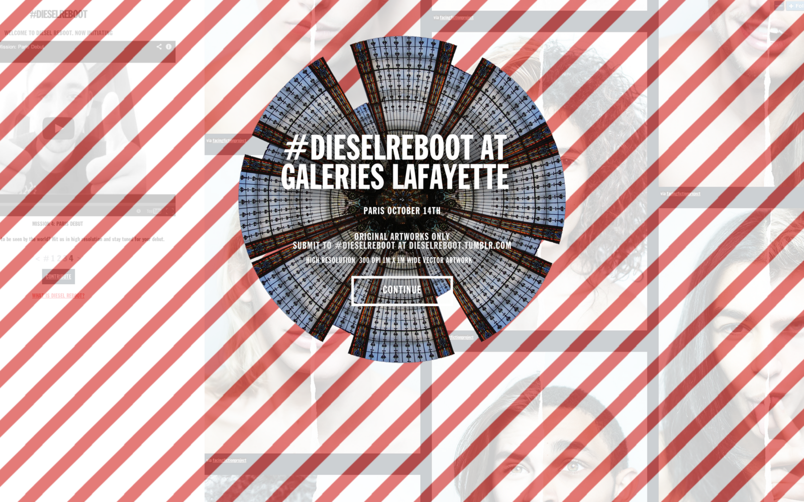 Ovim preuzimanjem od 14. do 24. listopada vidjet ćete izvorne ilustracije zatrpanih prijava na # Dieselreboot Tumblr prikazane u neviđenim razmjerima u Galeries Lafayette, pretvarajući kultnu parišku shopping destinaciju u galeriju potopljenu s brojnim umjetničkim djelima iz globalne Tumblr umjetnosti, pod vodstvom Kustosa, novog umjetničkog direktora Diesela Nicola Formichettija . Ovo je četvrta Formichettijeva misija ' Pokaži mi svoje djelo ' , koja pokreće novu fazu povijesti Diesela .