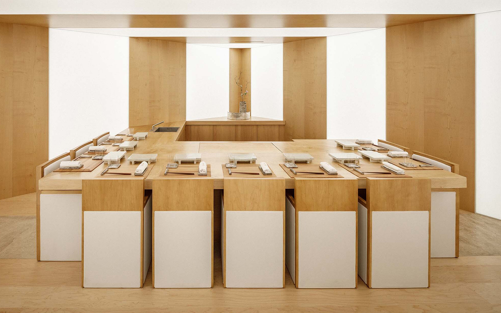 Nakon što se metalnim stepenicama popnete na prvi kat, dočekat će vas misteriozni hodnik okružen s nekoliko skrivenih vrata. Iza jednih od njih nalazi se Sushi Yoshinaga restoran, nazvan po master chefu Tomoyuki Yoshinagi. Prostor odiše toplom bojom karamele koji krasi drvenarija od javora, pružajući graciozan kontrast u zid umetnutim kutijama s bijelim svjetlom. Za sushi šankom u obliku slova L nalazi se deset sjedećih mjesta koje prate srebrno sivi stolni predmeti od keramike čiji rad potpisuje japanski umjetnik keramike Masanobu Ando.