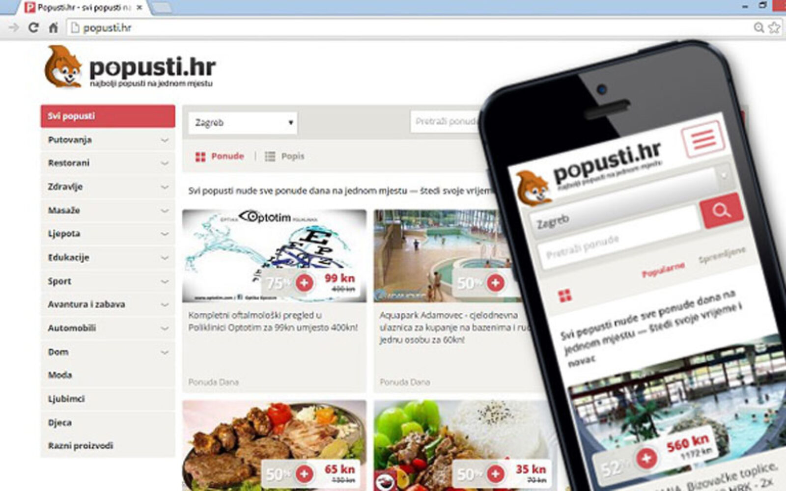 Popusti su novi agregator grupnih kupovina koji na jednom mjestu sadrži popuste sa svih većih portala u Hrvatskoj i zadivljuje svojim modernim responsive dizajnom i naprednim opcijama. Prilagođen je za brže i jednostavnije pronalaženje ponuda koje vas zanimaju. Takav princip rada korisnicima omogućuje da pretražuju sve ponude na jednom mjestu i svi popusti vam postaju dostupniji nego ikada prije.