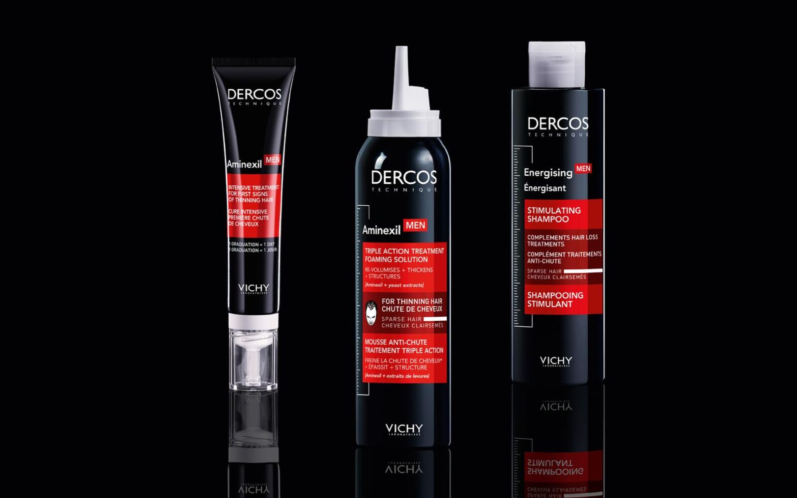 Za muškarce s prorijeđenom kosom po čitavom tjemenu u ponudi je Aminexil MEN pjena trostrukog djelovanja koja trenutačno zadebljava vlas i daje strukturu, a njena lagana i prozračna pjenušava tekstura omogućuje lako nanošenje čak i na osjetljivo vlasište. Kosa je u trenutku oblikovana i spremna za izlazak iz kuće u svakodnevne obaveze.