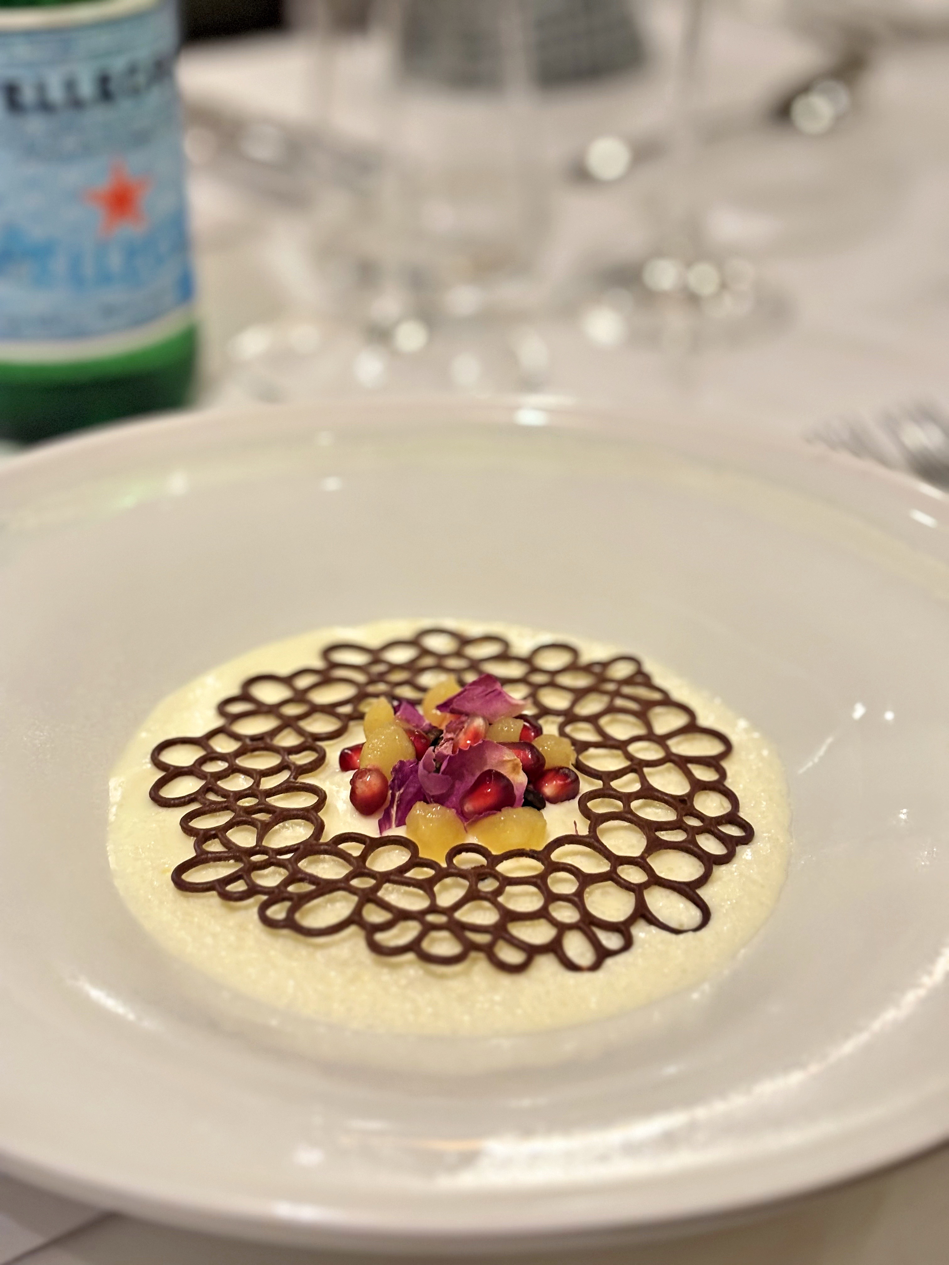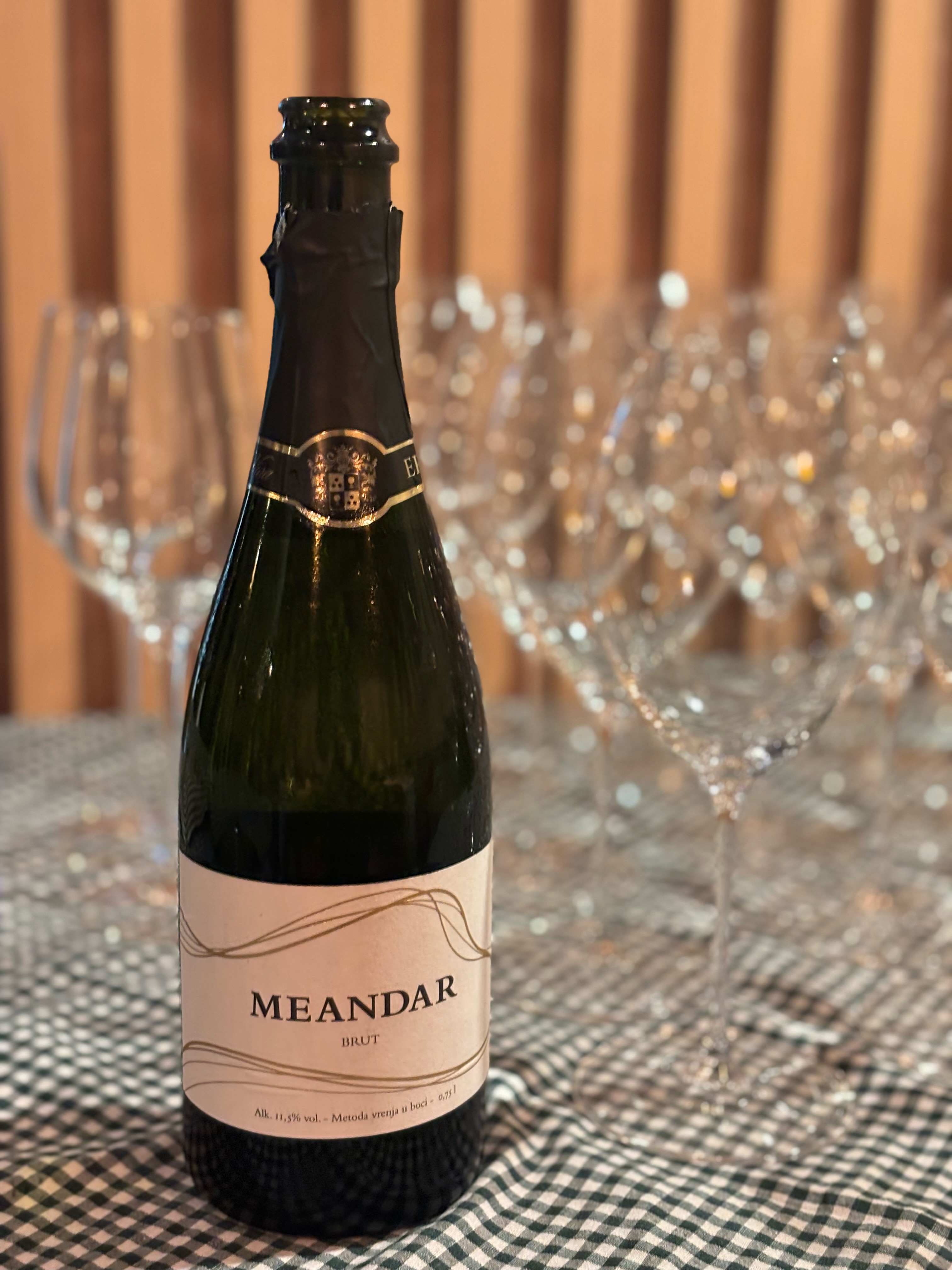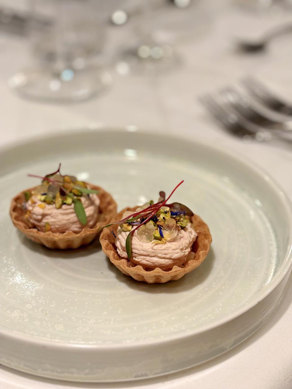 Za početak je goste dočekao mali tart od prhkog tijesta od lješnjaka punjen guščjom jetrom pripremljenom na dva načina. Tu je terina kao donji sloj, nadalje slijedi konfitirana kruška te gel od kruške kao završni sloj, pistacio i slana nota u obliku dimljene soli. Uz prvi slijed je poslužen pjenušac Meandar iz 2021. godine kao idealan balans uz ovo jelo.