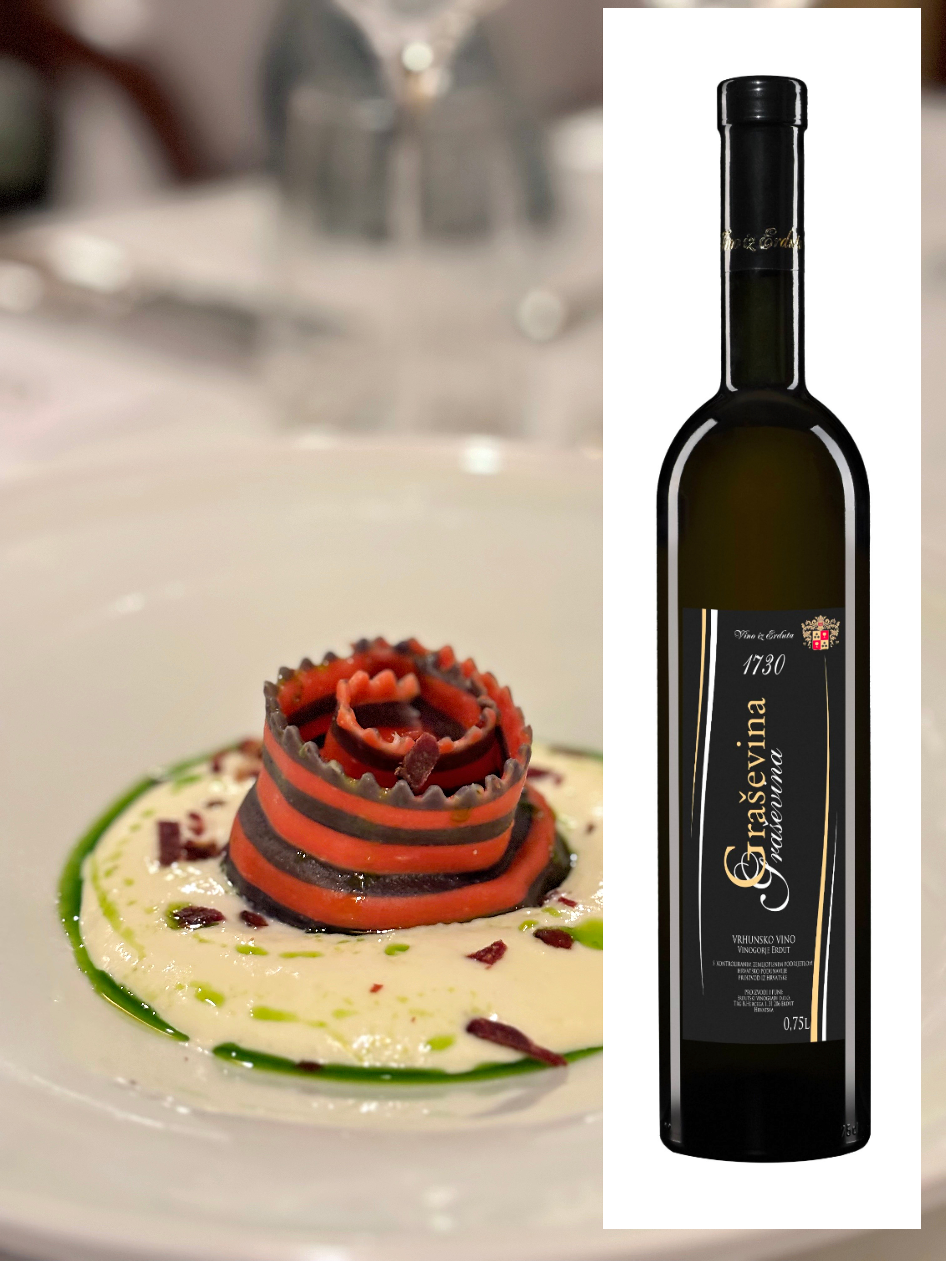 Nakon malih zalogaja, gosti su kušali ručno rađenu tjesteninu u dvije boje koja je punjena s čak dva punjenja, a to su bundeva i kesten. Tjestenina je poslužena u espumi od sira Veli Jože i posuta hrskavim čipsom od patke. Radi se o jelu koje je uistinu kompleksno i kod same pripreme pa tako i na nepcu. Uz ovo jelo je posluženo vrhunsko vino, Graševina Vina Erdut berbe 2021. godine. Korisno je reći da bi dobar supstitut bilo i kvalitetno vino iste marke, Graševina Vina Erdut berbe 2022. koje je ove godine dobilo zlato na Mundus Viniju, odnosno srebro na Decanteru i koje je top seller ove vinarije.