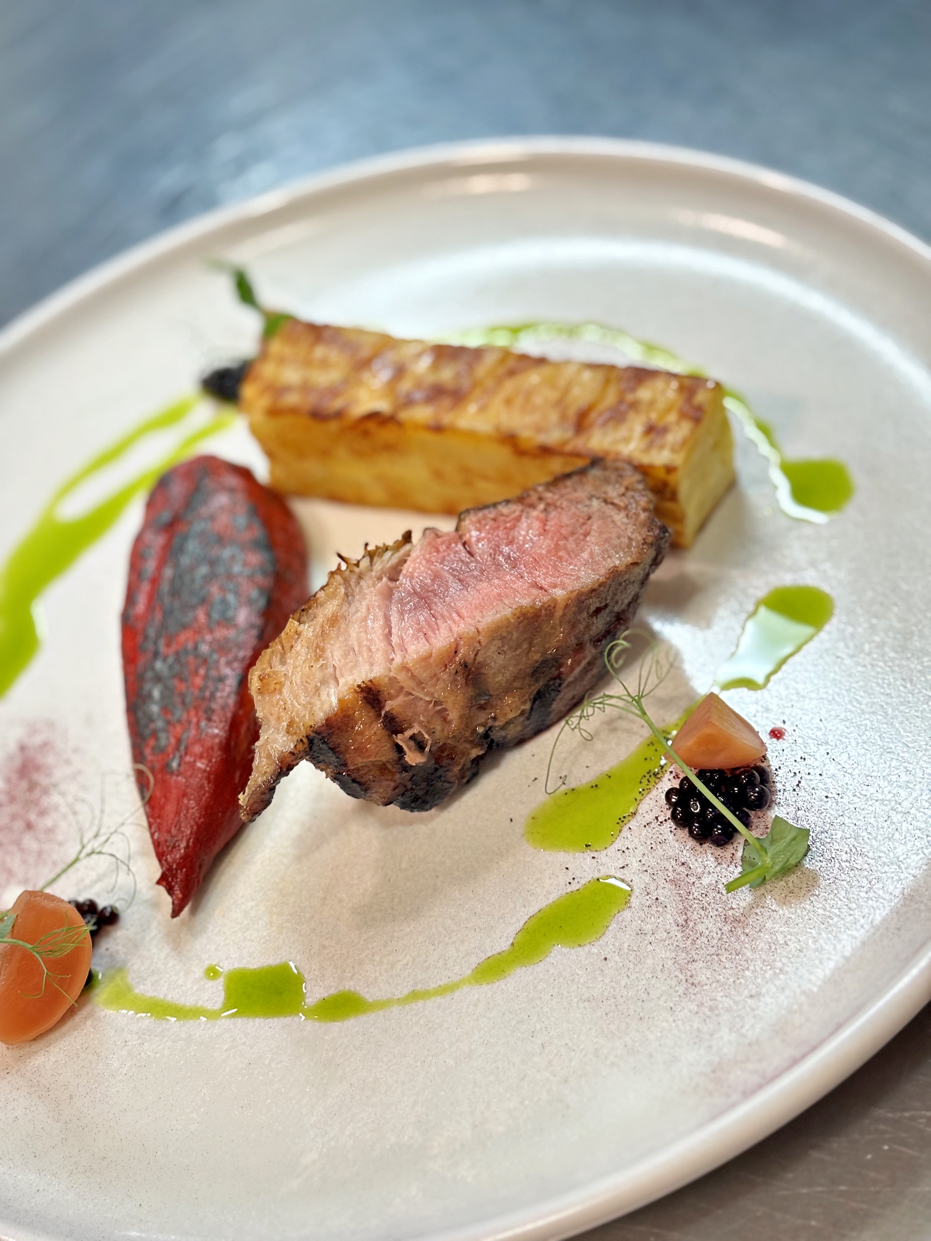 Kao glavno jelo je poslužen vrhunski komad mesa, ribeye steak iberico svinje, pečen na kamado roštilju, uz dimljenu i pečenu crvenu papriku i romesco umak te pave od krumpira. Uz ovaj slijed je sljubljeno vrhunsko vino Merlot iz 2021. godine marke Vina Erdut.