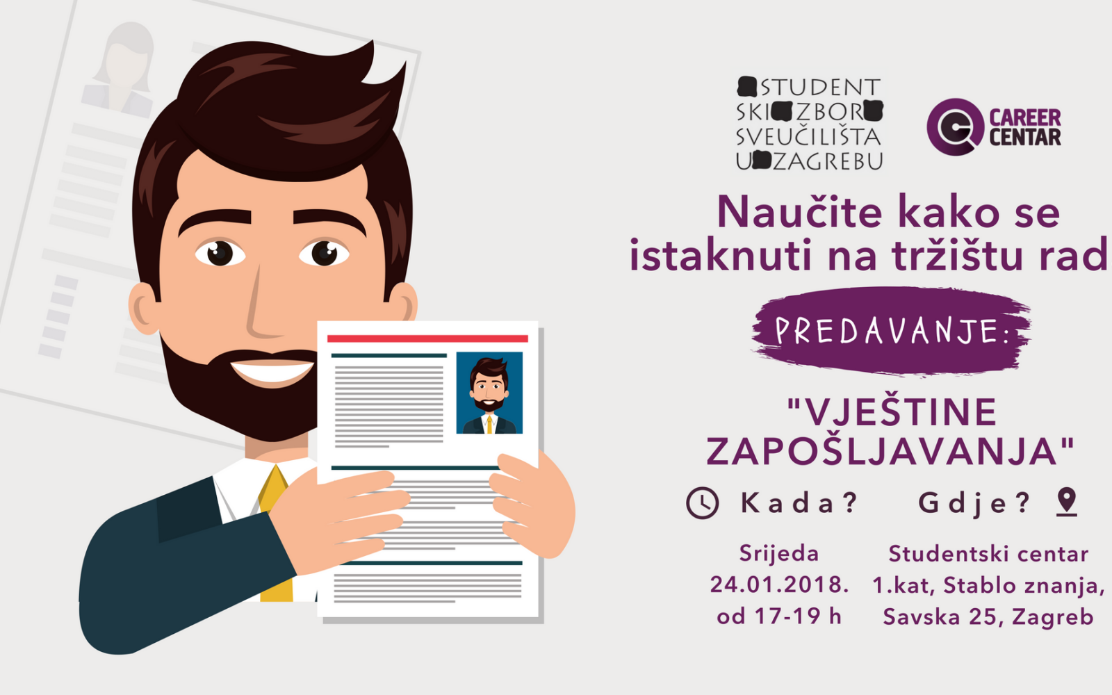 Kako bi studentima omogućili uspješan izlazak na tržište rada, Studentski zbor Sveučilišta u Zagrebu i CareerCentar organiziraju besplatno predavanje Vještine zapošljavanja.