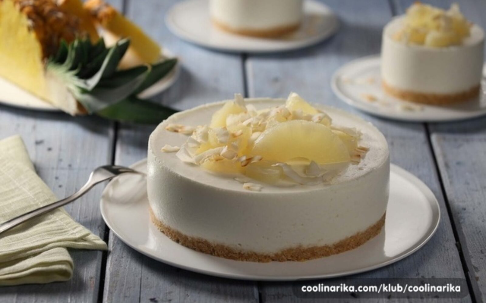 1. Mješavini za podlogu dodajte kokosovo brašno, navlažite mlijekom i dobro promiješajte. 2. Dodajte otopljeni maslac, promiješajte i ravnomjerno rasporedite u kalup za torte promjera 24 cm. Utisnite žlicom da dobijete podlogu i stavite u hladnjak na 20 minuta. 3. Ananas iz kompota (300 g) usitnite u pire, a ostatak narežite. 4. Pomiješajte mlijeko i kokosovo mlijeko, dodajte prašak za pripremu kreme. Miješajte električnom miješalicom da dobijete kremu. 5. Dodajte sir i pire od ananasa te nastavite miješati dok ne dobijete jednoličnu kremu. Kremu nanesite na ohlađenu podlogu. 6. Cheesecake ostavite u hladnjaku najmanje 2 sata prije posluživanja. 7. Kokosovo brašno zagrijte u tavi do zlatne boje (tostirajte) i ohladite.