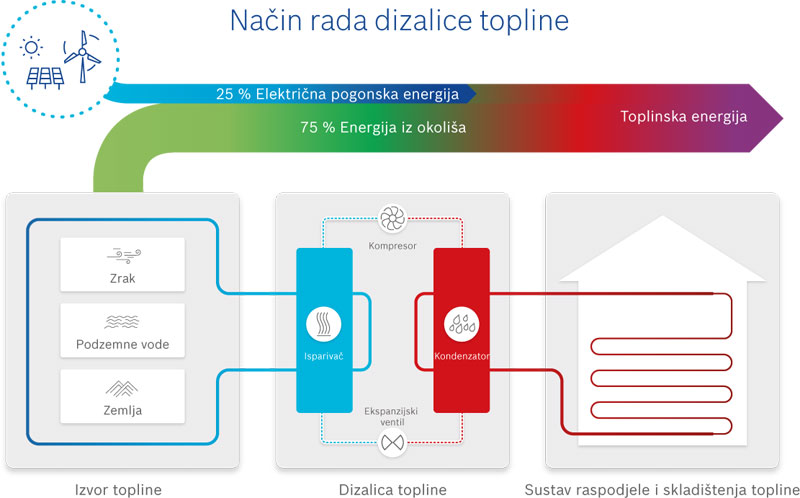 Prikladnim zahvatima ta velika količina energije može se smanjiti te tako osjetno utjecati i na smanjenje emisije CO2, ali i na osobne troškove. Jedno od rješenja koje nam može pomoći u tome je dizalica topline. Riječ je inovativnom proizvodu koji koristeći energiju preuzetu iz zraka istovremeno osigurava pouzdano grijanje, hlađenje i toplu vodu. Njen način rada najlakše je objasniti kazavši da radi obrnuto od hladnjaka. Kada hladnjak hladi, toplina se proizvodi kao “otpad”.