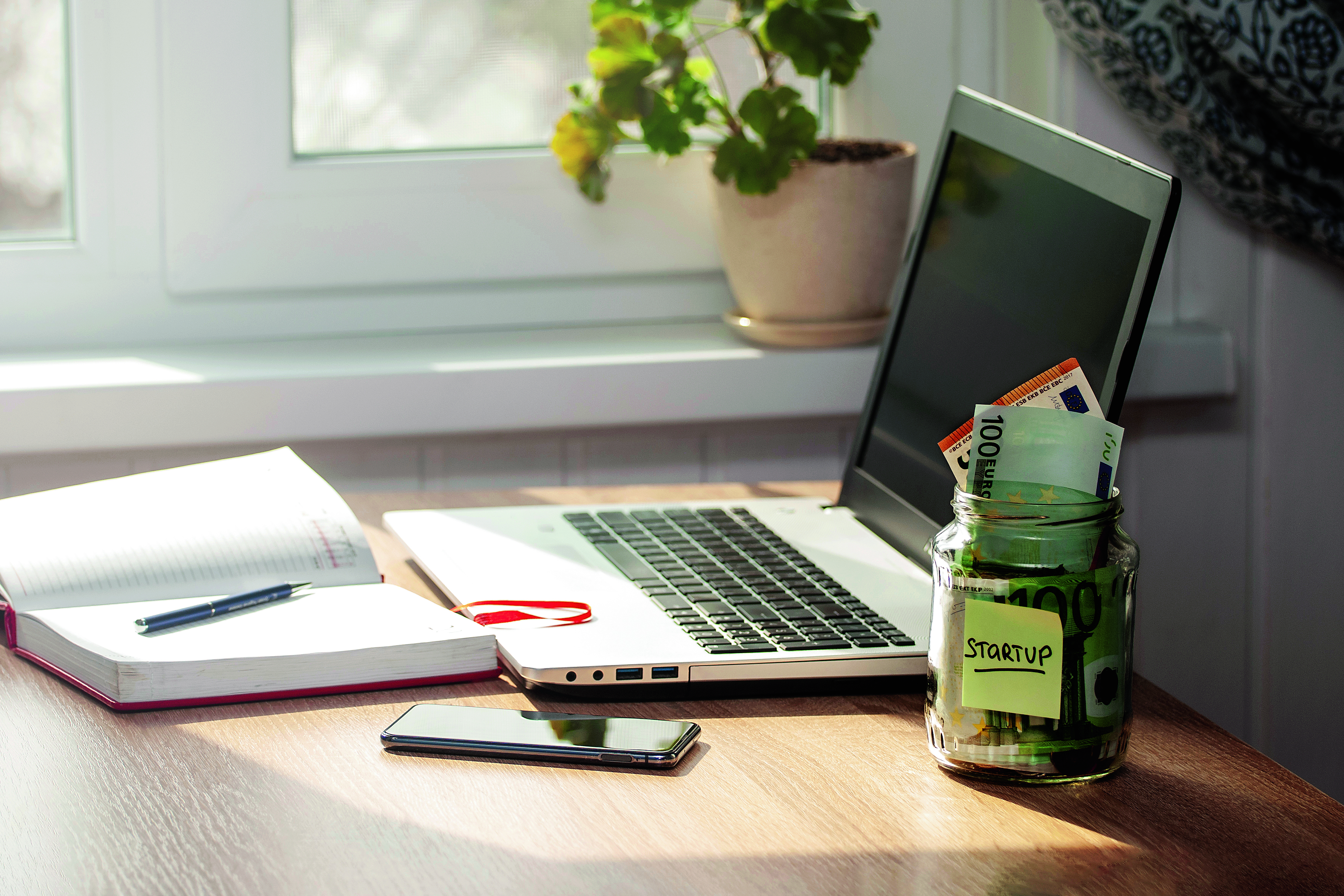 A glass jar with STARTUP written on it, with coins and banknotes inside stands on a desk.The concept is funding and promoting an innovative idea. Laptop, smartphone, diary on the desk.