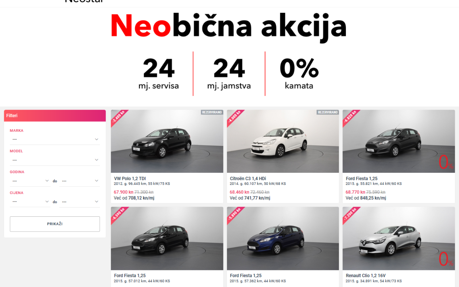 Počela je Neobična akcija za kupovinu rabljenih vozila u kojoj se, osim povoljnih cijena, nudi i pregršt pogodnosti i to samo u AutoZubak Neostaru. Naime, uz svako kupljeno vozilo na poklon kupac dobiva dvogodišnji servis i jamstvo, a uz to se dobiva i mobilno jamstvo i polica obveznog osiguranja u prvoj godini. Svako vozilo na www.neostar.hr može se pregledati fotografirano u tehnici 360 stupnjeva i to do svakog najsitnijeg detalja. Vozilo je moguće kupiti i preko interneta te se u tom slučaju kupljeni automobil dostavlja na kućnu adresu. Ukoliko se kupcu kupljeni automobil ne svidi odabrano vozilo može vratiti u roku do 15 dana. Uz sve navedene pogodnosti za kupce je pripremljeno i beskamatno financiranje putem kredita ili kupovinu automobila u ponudi putem leasing financiranja.