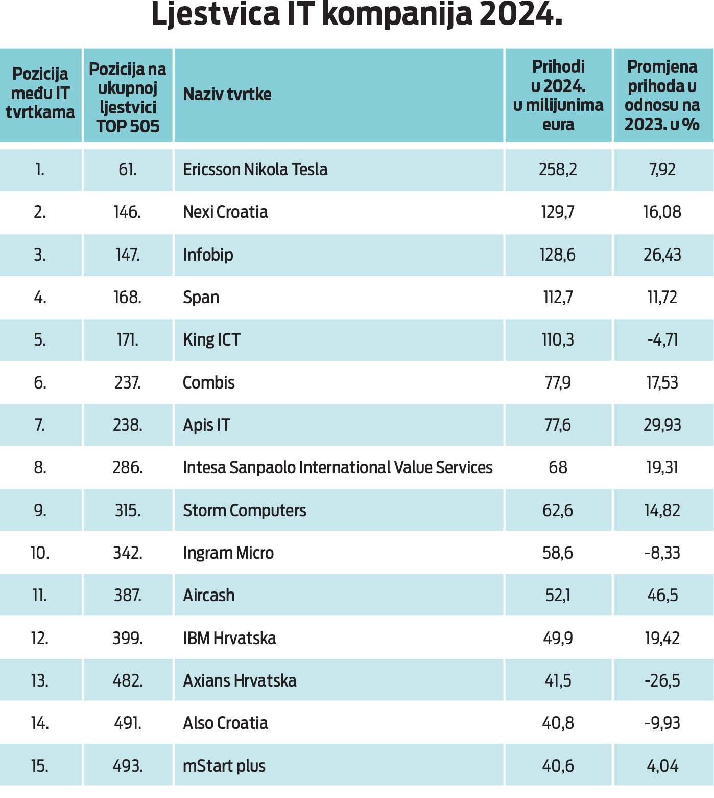 Iako podaci Dun & Bradstreeta govore o rastu prihoda Ericssona Nikole Tesle d.d. na razini Grupe, oni su smanjeni 18 posto u odnosu na 2023., na 249,5 milijuna eura. Najveća domaća ICT kompanija tako je lani bila jedna od ukupno pet IT kompanija s liste Top 505 čiji su ukupni prihodi pali. Osim Ericsson NT-u, prihodi su pali King ICT-u (-4,71 posto), Ingram Micru (-8,33 posto), Axiansu Hrvatska (-26,5 posto) te Alsu Croatia (-9,93 posto).