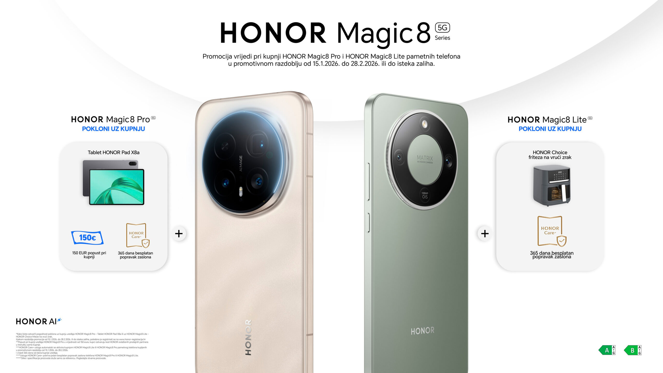 Početak prodaje prati i ekskluzivna ponuda koja traje do kraja veljače (ili do isteka zaliha). Svi koji se odluče za moćni Magic8 Pro u tom periodu, na poklon dobivaju tablet HONOR Pad X8a i značajan popust od 150 eura, dok kupce ultra izdržljivog Magic8 Lite modela očekuje praktična HONOR Choice friteza na vrući zrak. Dodatnu sigurnost za oba modela pruža uključeno HONOR Care+ jamstvo koje pokriva popravak zaslona tijekom prve godine korištenja. Više informacija o posebnoj ponudi saznajte na https://www.honor.com/hr/events/honor-magic8-series-start-sales/.