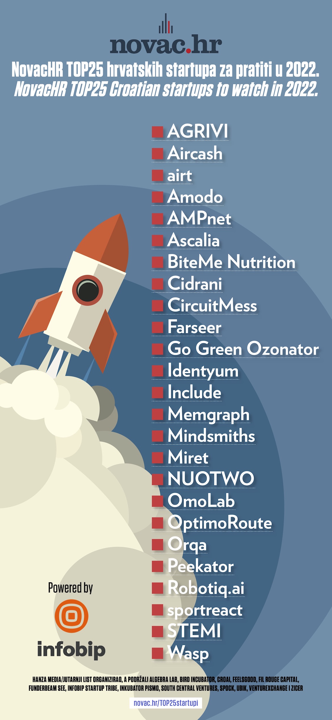 Ovo su imena 25 najperspektivnijih hrvatskih starupa koje vrijedi pratiti u 2022. godini, prema izboru portala NovacHR koji je okupio žiri od 14 poznavatelja domaće startup scene. U užem izboru našlo se čak 120 startupa koje su članovi žirija predložili.