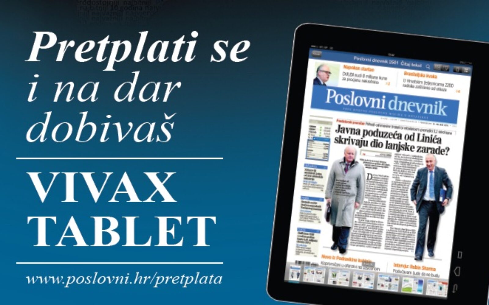 Svi novi pretplatnici koji odaberu godišnju kombiniranu pretplatu koja uključuje tiskano izdanje i digitalni paket Poslovnog dnevnika, dobit će vrijedan VIVAX tablet TPC-78100 u vrijednosti od čak 1099,00 kuna.