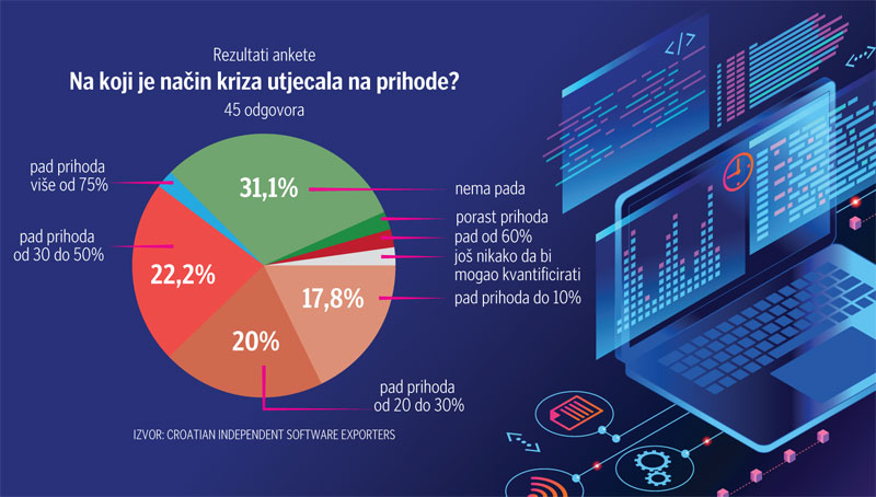 Njih 17,8% to osjeti blago, s padom do 10%. Petina bilježi pad 20-30%, a 22,2%, ima minus bod 30-50 posto, a po nekoliko postotaka bilježi pad od 60 posto i još toliko softveraša ima pad prihoda veći od 75%.