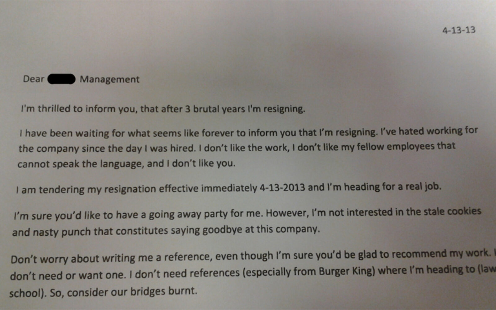 Bivši radnik u pismu navodi kako mu ne trebaju nikakve preporuke od Burger Kinga te da kreće studirati pravo. "Smatrajte da su naši mostovi spaljeni", zaključuje se u pismu.