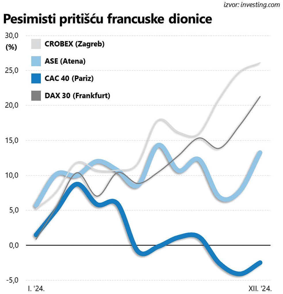 Negativnih reakcija agencija za procjenu kreditnog rejtinga ove je godine bilo pregršt. Moody’s je u prosincu Francusku degradirao na Aa3 (tri stepenice od vrha ljestvice), a sličan je potez Standard & Poor’s povukao još u svibnju, opravdavši na neki način negativne reakcije ulagača. Pesimizam pritom nije sveden samo u relativno uske okvire tržišta obveznica. Naime, Pariz je jedno od rijetkih kontinentalnih tržišta koje u odnosu na početak godine bilježi negativan pomak. Grčka je, dakako, čvrsto na pozitivnom teritoriju, baš kao i Njemačka (hrvatski CROBEX je u promatranom razdoblju otišao još i dalje).