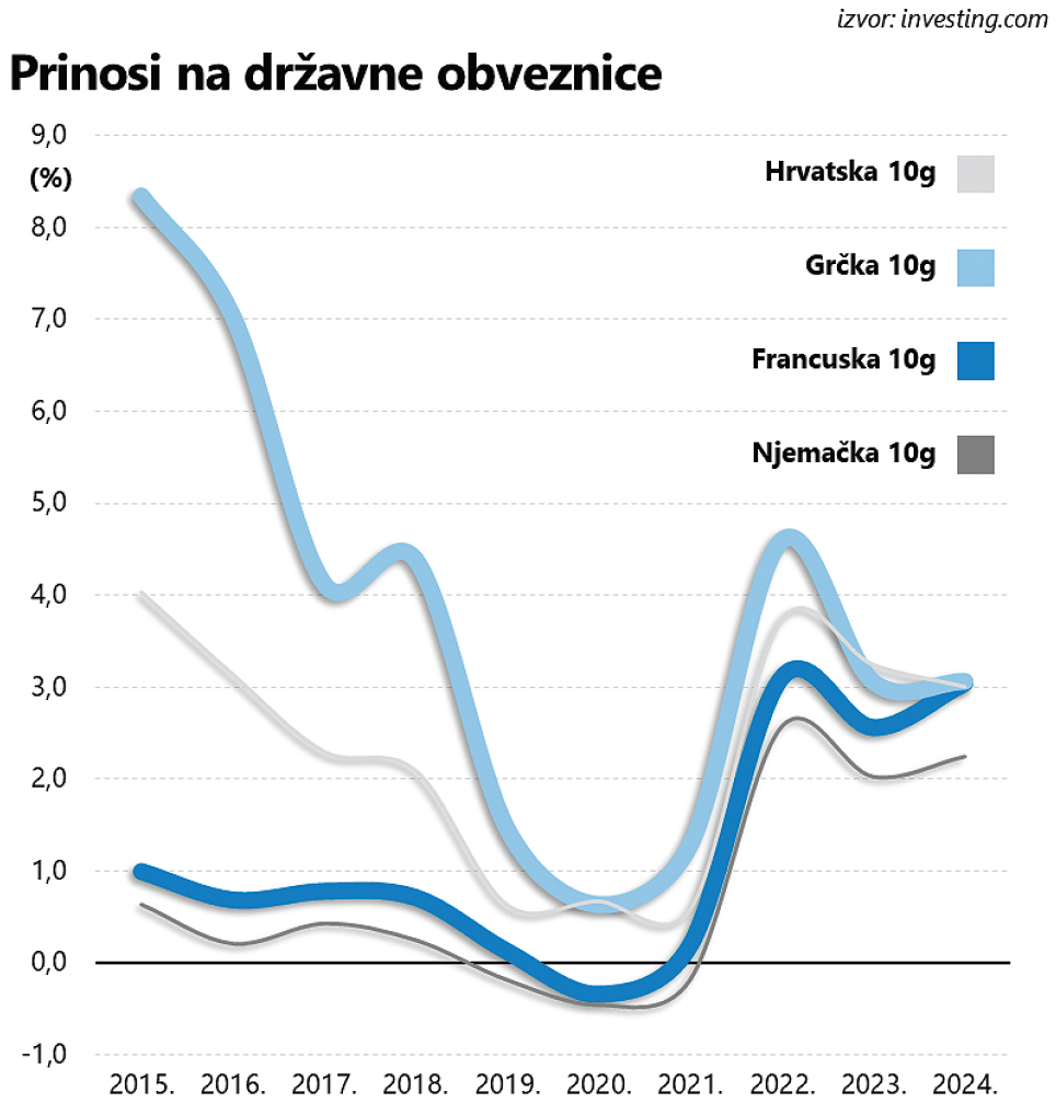 Oportunistima se upornost (i ogroman rizik) u konačnici itekako isplatila. Jer danas, nakon niza pozitivnih revizija koje su Grčkoj napokon priskrbile i investicijski (BBB-) kreditni rejting, prinosi na (desetogodišnje) državne obveznice i dalje su bitno viši od njemačkih, ali tek neznatno iznad hrvatskih (unatoč zamjetnom jazu kada je u pitanju kreditni rejting) i, što je za ovu priču još važnije, otprilike u rangu – francuskih. Zvuči nevjerojatno, jer druga po veličini europska ekonomija i ključan akter na kontinentalnoj političkoj sceni slovi za jednog od ključnih stupova Europske unije,. I baš zato je nazadovanje Francuske puno važnija tema od impresivnog grčkog oporavka (barem iz perspektive financijskih tržišta) koji je 2015. godine poprimio prepoznatljive obrise.