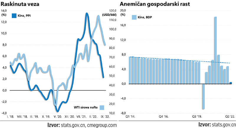 U listopadu prošle godine, kada cijena sirove nafte preskače granicu od 80 dolara po barelu, kineski PPI indeks na godišnjoj razini bilježi rast od gotovo 14%; pet mjeseci kasnije, u ožujku ove godine, dok se cijena nafte kreće između 100 i 130 dolara po barelu, kineski PPI već se izražava jednoznamenkastim brojkama. I dok je rast proizvođačkih cijena u SAD-u tek u kolovozu ove godine sveden u jednoznamenkaste okvire, u Kini je u kolovozu iznosio tek mizernih – 2,3%. A to nije ništa drugo doli odraz nemoći, ili još konkretnije, anemičnog gospodarskog rasta koji se s određenim vremenskim odmakom prelio i na tržišta roba.