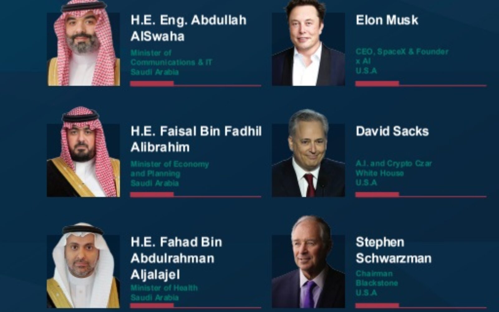Elon Musk, izvršni direktor Tesle i Trumpov savjetnik, naveden je kao govornik, a našao se u Saudijskoj Arabiji samo nekoliko mjeseci nakon što je Tesla najavila ulazak na saudijsko tržište. Musk je ranije imao promjenjiv odnos sa Saudijskom Arabijom zbog neuspjelih poslovnih dogovora, no nedavni razvoj događaja ukazuje na poboljšanje odnosa.