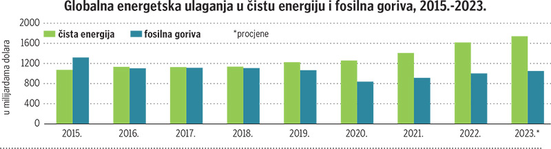 Globalno će se 2023. u energiju uložiti oko 2,8 bilijuna američkih dolara, a očekuje se da će više od 1,7 bilijuna otići u čiste tehnologije što uključuje obnovljive izvore energije, električna vozila, nuklearnu energiju, mreže, skladištenje, goriva s niskim emisijama, poboljšanja učinkovitosti i dizalice topline. Ostatak, nešto više od bilijuna dolara, odnosi se na ugljen, plin i naftu, ističe se u izvješću.