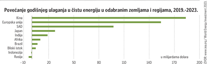 IEA predviđa da će godišnja ulaganja u čistu energiju između 2021. i 2023. porasti za 24 posto, najviše potaknuta obnovljivim izvorima energije i električnim vozilima. S druge strane, ulaganja u fosilna goriva trebala bi porasti 15 posto. Ono što zabrinjava je činjenica da više od 90 posto povećanja dolazi iz razvijenih gospodarstava i Kine, što predstavlja ozbiljan rizik od novih podjela u globalnoj energetici ako tranzicije čiste energije ne zažive jednako svuda.