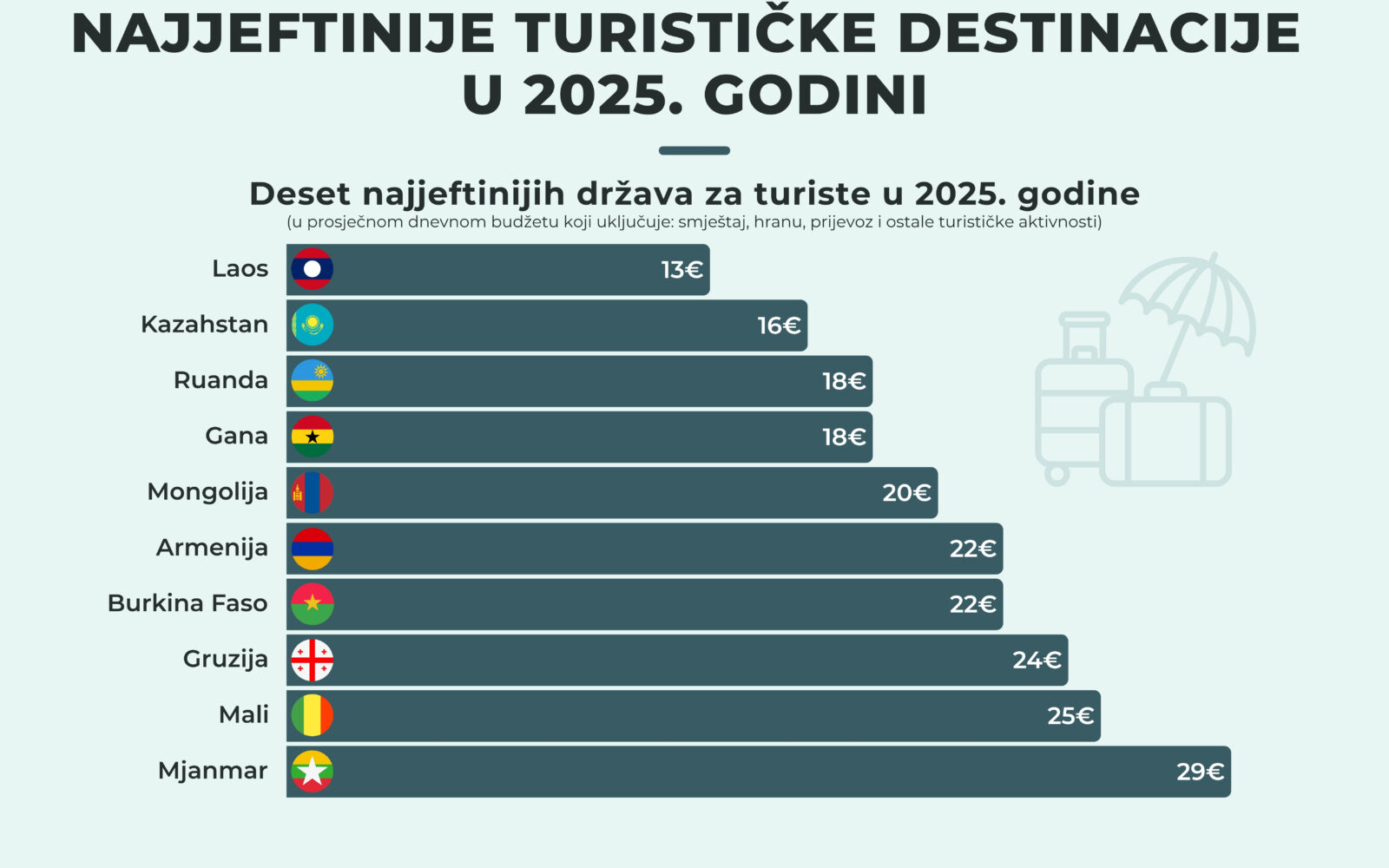 Najjeftinije ćete proći u Laosu, tamo vam dnevni budžet ne mora biti veći od 13 eura. Nakon toga slijede Kazahstan, gdje vam je dovoljno 16 eura dnevno, pa Ruanda i Gana, za koje je dovoljno izdvojiti dnevno 18 eura. Mongolija je skuplja za dva eura, tamo je 20 eura dnevno, dok se za odmor u Armeniji ili Burkini Faso treba izdvojiti 22 eura. Na posljednja tri mjesta sue Gruzija, Mali i Mjanmar (24, 25 i 29 eura dnevno).
