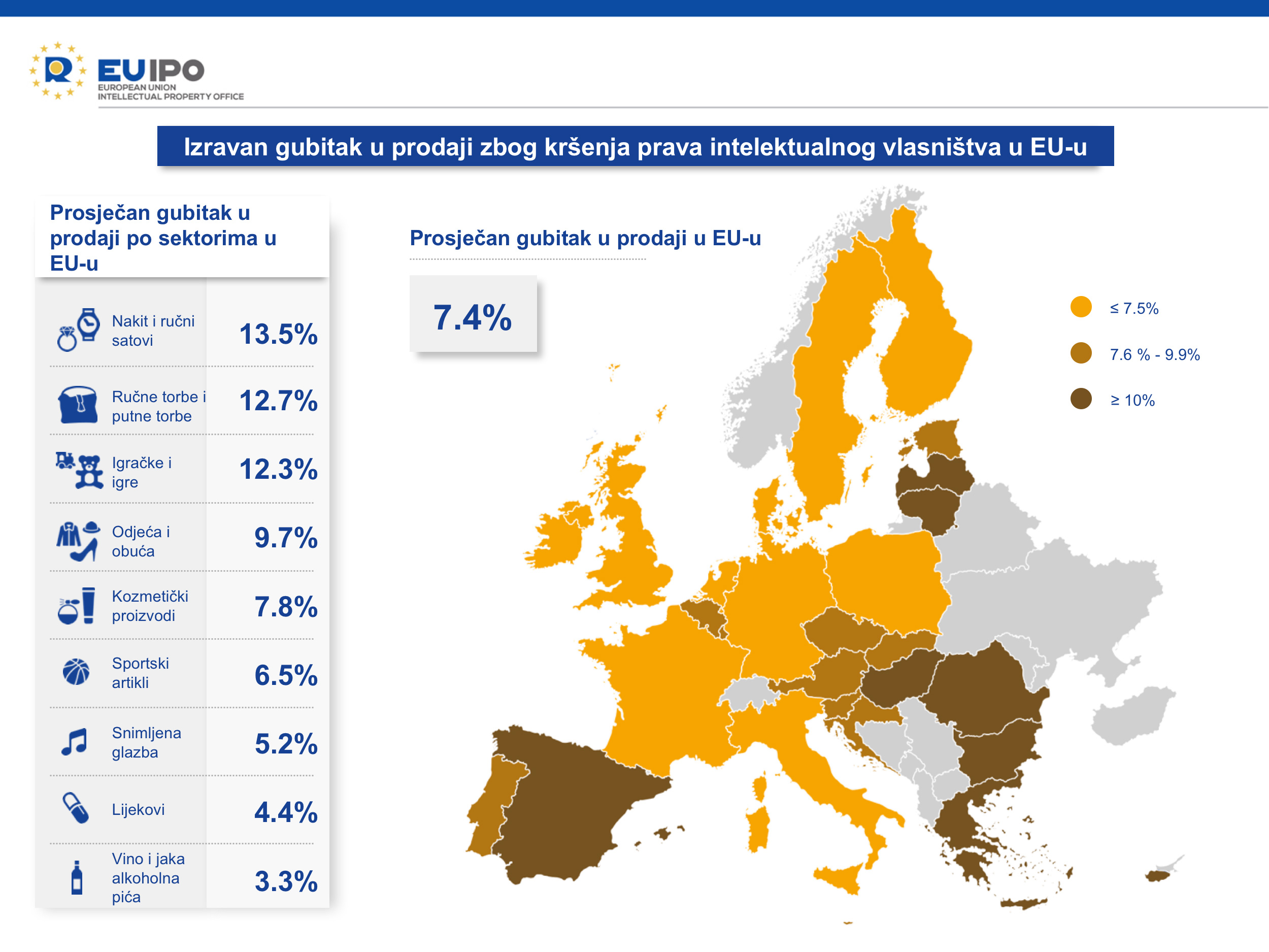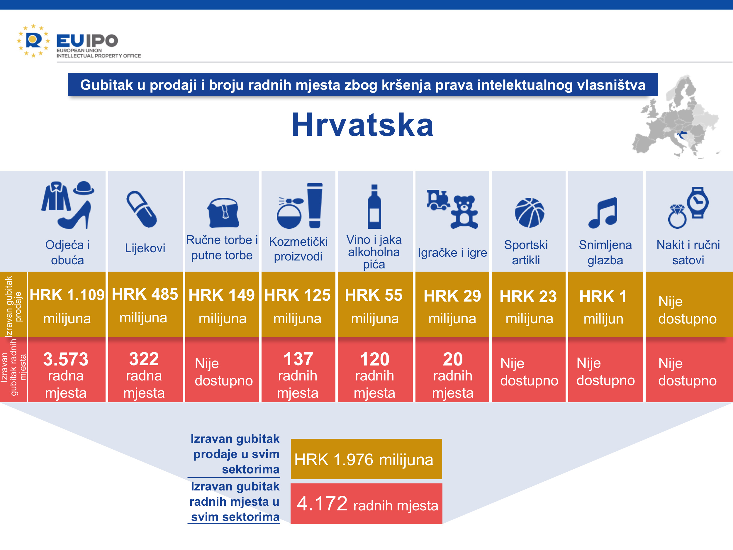 Relativni gubici prodajnih prihoda i radnih mjesta uzrokovani krivotvorenjem u Hrvatskoj su iznad prosjeka EU-a. Torbice su sektor koji je ponajviše pogođen gubicima u prodaji u usporedbi s prosjekom EU-a.
