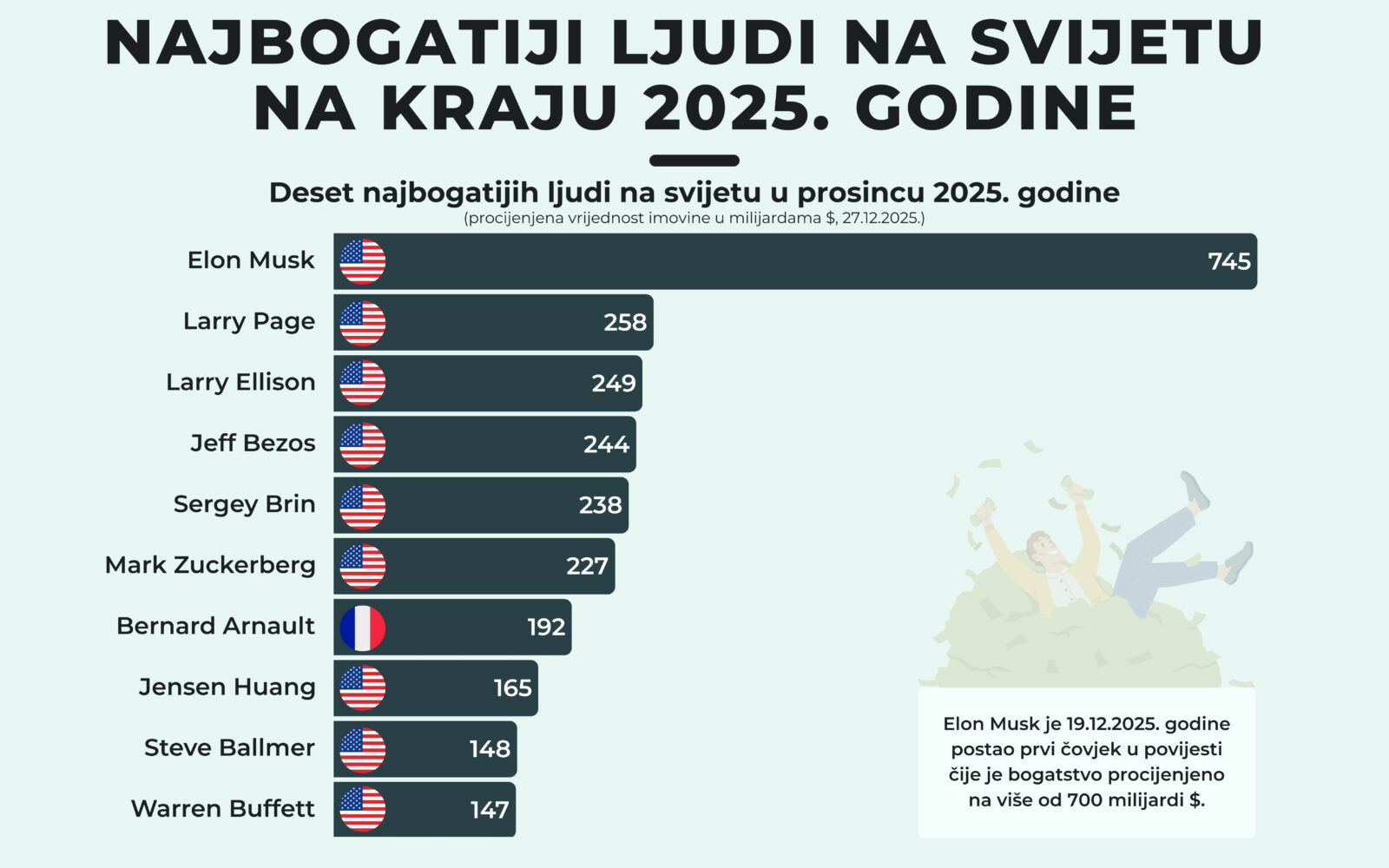 Uz njih su Larry Ellison (249 milijardi dolara), Jeff Bezos (244 milijardi dolara) i Mark Zuckerberg (277 milijardi dolara). Među američkim imenima isticao se i Bernard Arnault, jedini Europljanin u vrhu liste. Bogatstvo ovog Francuza procjenjuje se na 192 milijardi dolara. Top 10 zatvaraju Jensen Huang (165 milijardi), Steve Ballmer (148 milijardi) te Warren Buffett (147 milijardi dolara).