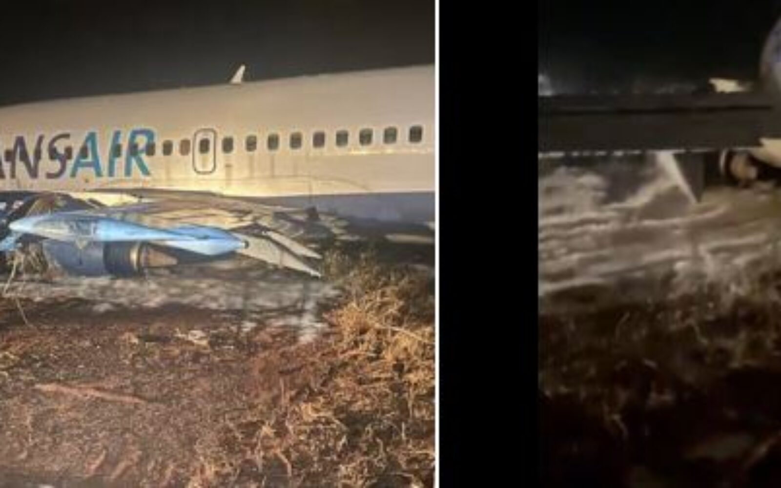 Noćni video na društvenim mrežama prikazuje avion s logom senegalske zrakoplovne kompanije Transair u travi s krilom prekrivenim pjenom za suzbijanje požara.