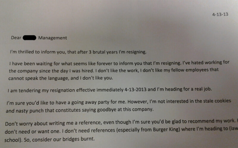oštro pismo Biste li ikad dali otkaz na ovako drastičan način? Nezadovoljni radnik fast-food lanca Burger King nakon tri godine rada dao je otkaz i to pismom u kojem ne nedostaje oštrih riječi.
