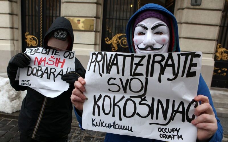 prosvjed Occupy Croatia ispred Sabora: Privatizirajte svoj kokošinjac! Njihov današnji prosvjed bio je motiviran najavljenom donošenju Zakona o strateškim investicijama.