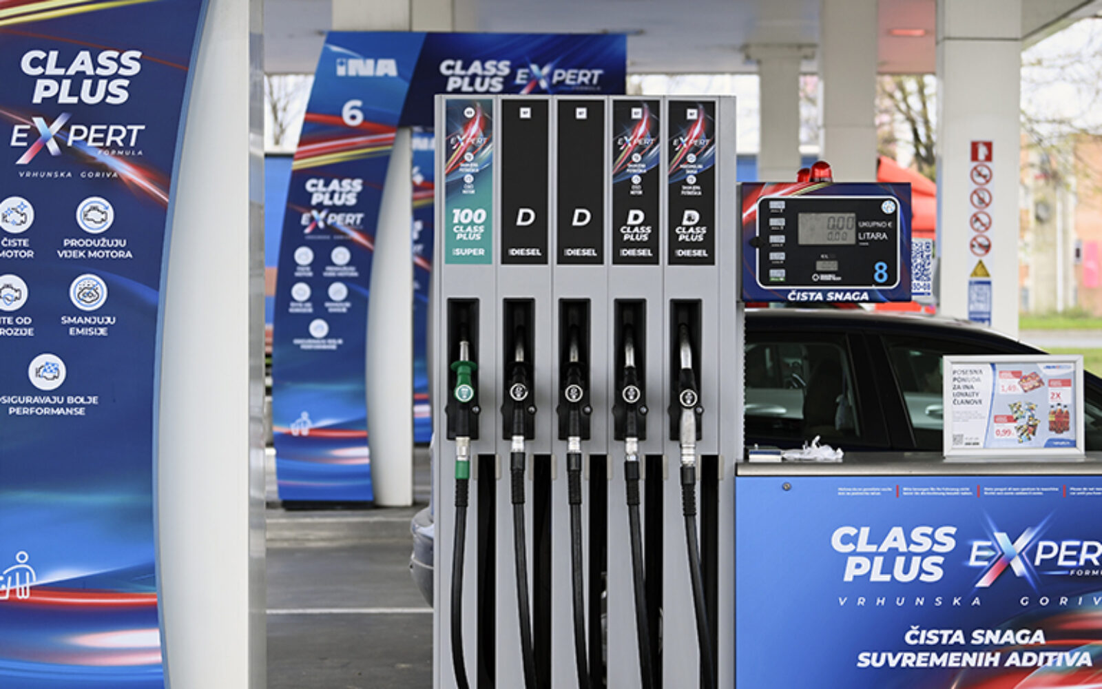 INA Class Plus Expert Novo premium gorivo znatno poboljšava performanse i snagu motora, održava ga čistim i čini trajnijim, što je dugoročno korisno za novčanik kao i za okoliš Osim visokokvalitetnim gorivom, na Ininim crpkama može se opskrbiti brojnim drugim proizvodima, uz korištenje različitih usluga poput plaćanja računa, Aircasha i Paysafea.