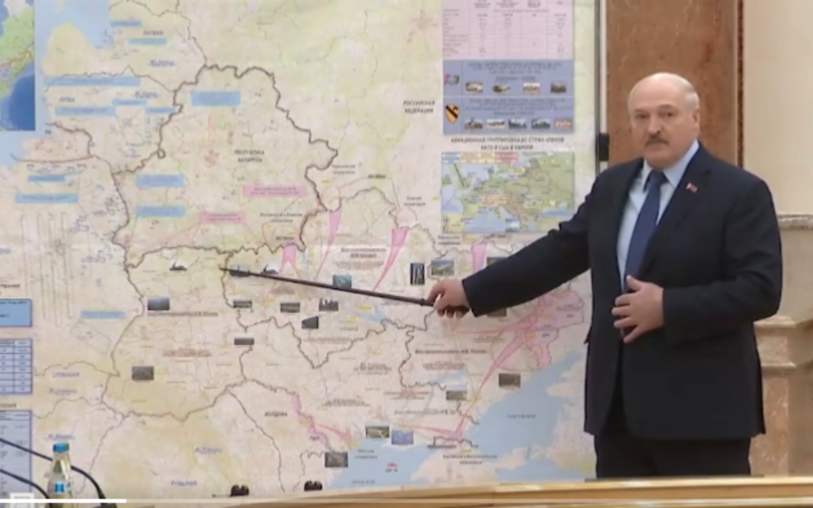 štapom pokazivao planirano kretanje trupa Je li Lukašenko slučajno otkrio sljedeću Putinovu metu? Na karti koju je Lukašenko pokazivao, Ukrajina je podijeljena na četiri dijela.