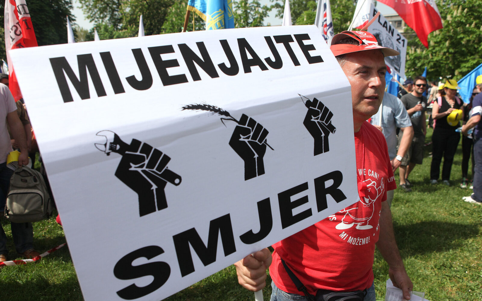 1. svibanj ‘Posljednji je trenutak – mijenjajte smjer!’ Prosvjednici transparentima i povicima poručuju vladajućima da promjene smjer svoje politike ili će ih maknuti s vlasti.
