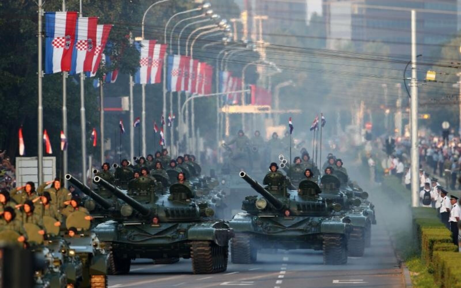 Proslava u Zagrebu Svečani mimohod: Najspremniji hrvatski vojnici i policajci, najbolje vojno naoružanje U impresivnoj koloni, dužoj od četiri kilometra koračali su aktivni vojnici, ratni veterani, dragovoljci, vozile suvremene Patrije, moćne pedeset tonske haubice, tenkovi M-84 i druga motorozirano-menhanizirana oklopna vozila.