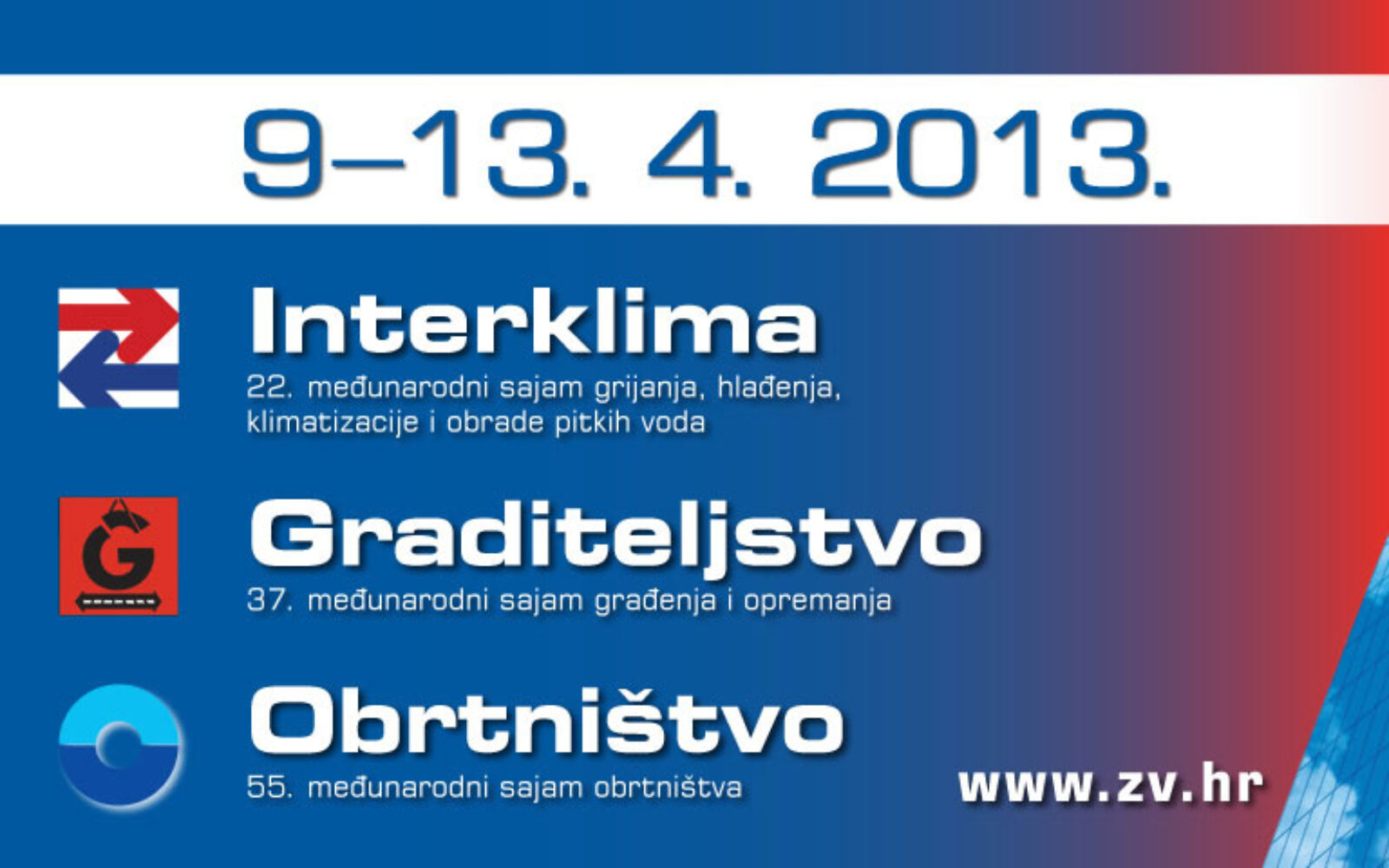 Poslovni.hr Zanimaju vas obrtništvo i graditeljstvo? Posjetite Zagrebački velesajam od 9. do 13. travnja! Na Zagrebačkom velesajmu od 9. do 13. travnja 2013. održavaju se sajmovi Interklima, Graditeljstvo i Obrtništvo, vodeći specijalizirani sajmovi ove vrste u Hrvatskoj.