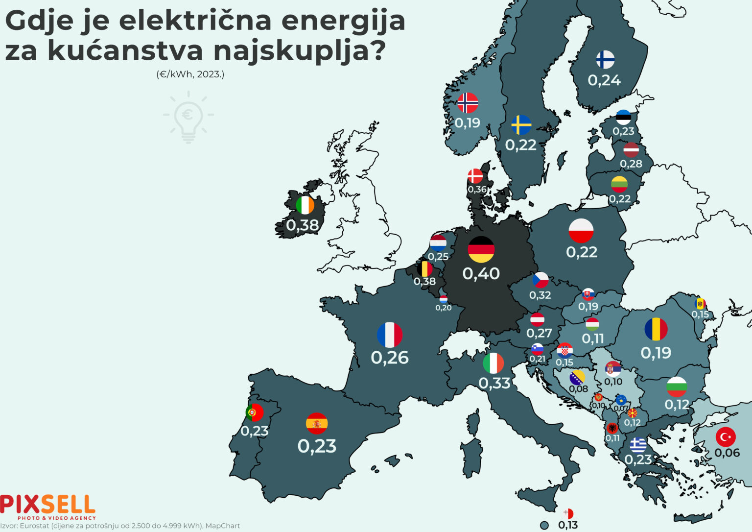 Konkretnije, kad su u pitanju kućanstva Europske unije s godišnjom potrošnjom između 2500 i 5000 kilovatsati, u Hrvatskoj građani plaćaju 15 eurocenti za kilovatsat, uključujući sve poreze i davanja.