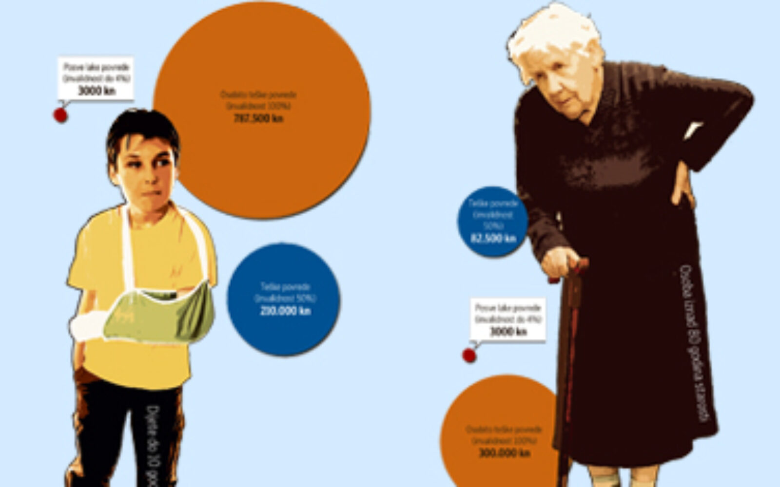 Ako u prometnoj nezgodi osobito teške povrede zadobiju unuk životne dobi do 10 godina i baka starija od 80 godina, odšteta za unuka iznosi 787.500, a baku 300.000 kuna. Ovo je tek jedna od ilustracija mogućih odšteta iz konačnog prijedloga Orijentacijskih medicinskih tablica za procjenu oštećenja tjelesnog i/ili duševnog zdravlja. Tablicama se povrede razvrstavaju u pet, a životna dob oštećenika u devet skupina.