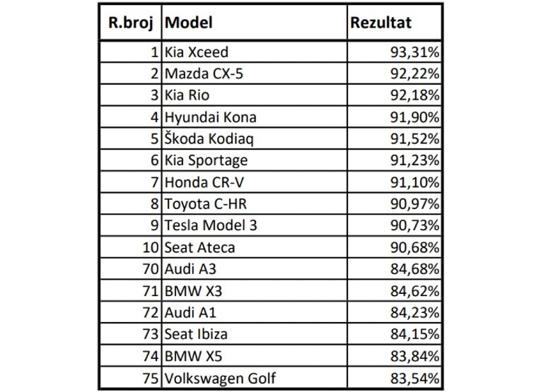 A sada pobjednici. To je definitivno Kia, čijih se pet modela probilo u Top 15. Krenimo redom i recimo kako je apsolutni pobjednik Kia XCeed. Ovaj je model dobio pohvale u svim područjima, a najviše ocjene je dobio za upravljivost, komfor, praktičnost, infotainment i kvalitetu – ukupno 93.31%.