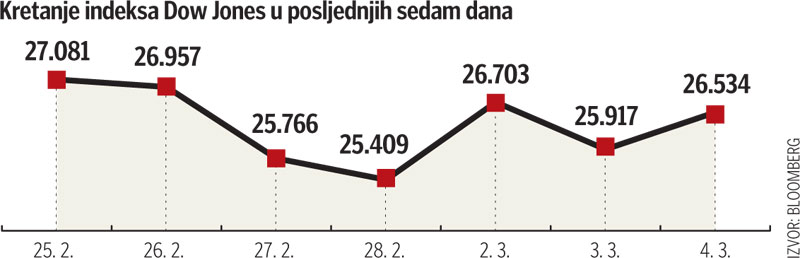 Posljednjih se dana na Wall Streetu trguje vrlo nestabilno, pa jedan dan cijene dionica oštro padnu, a drugi dan porastu. Valja naglasiti kako je skok Dow Jonesa u srijedu bio drugi najveći dnevni rast u povijesti, a drugi put u tri posljednja dana vrijednost tog dioničkog mjerila 30 američkih kompanija promijenila se za najmanje 1000 bodova. Takva dinamika trgovanja zadržala se i u četvrtak s obzirom da je na otvaranju trgovanja Dow Jones potonuo 700 bodova.
