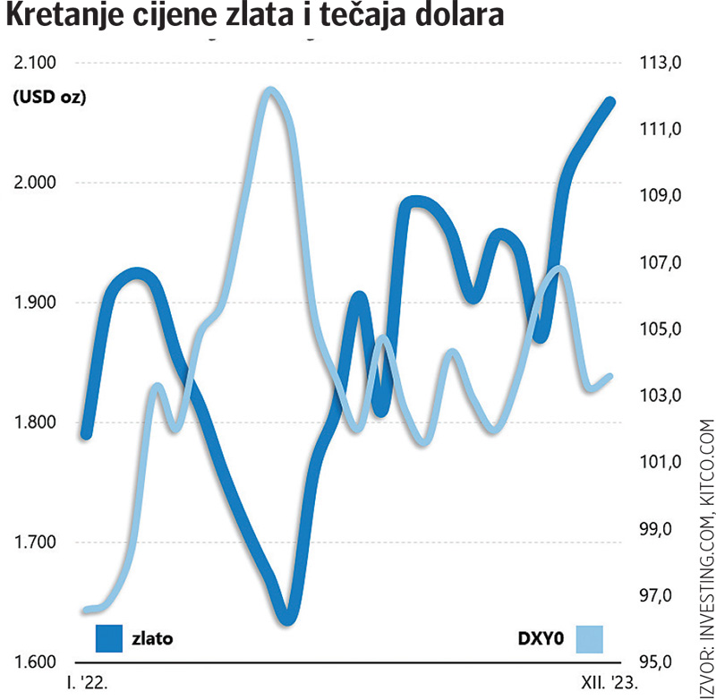 Zahvaljujući specifičnim okolnostima, cijena zlata ovoga je tjedna, barem nominalno (ne uzimajući u obzir inflaciju), dosegnula novi povijesni rekord, preskočivši granicu od 2100 dolara po unci.