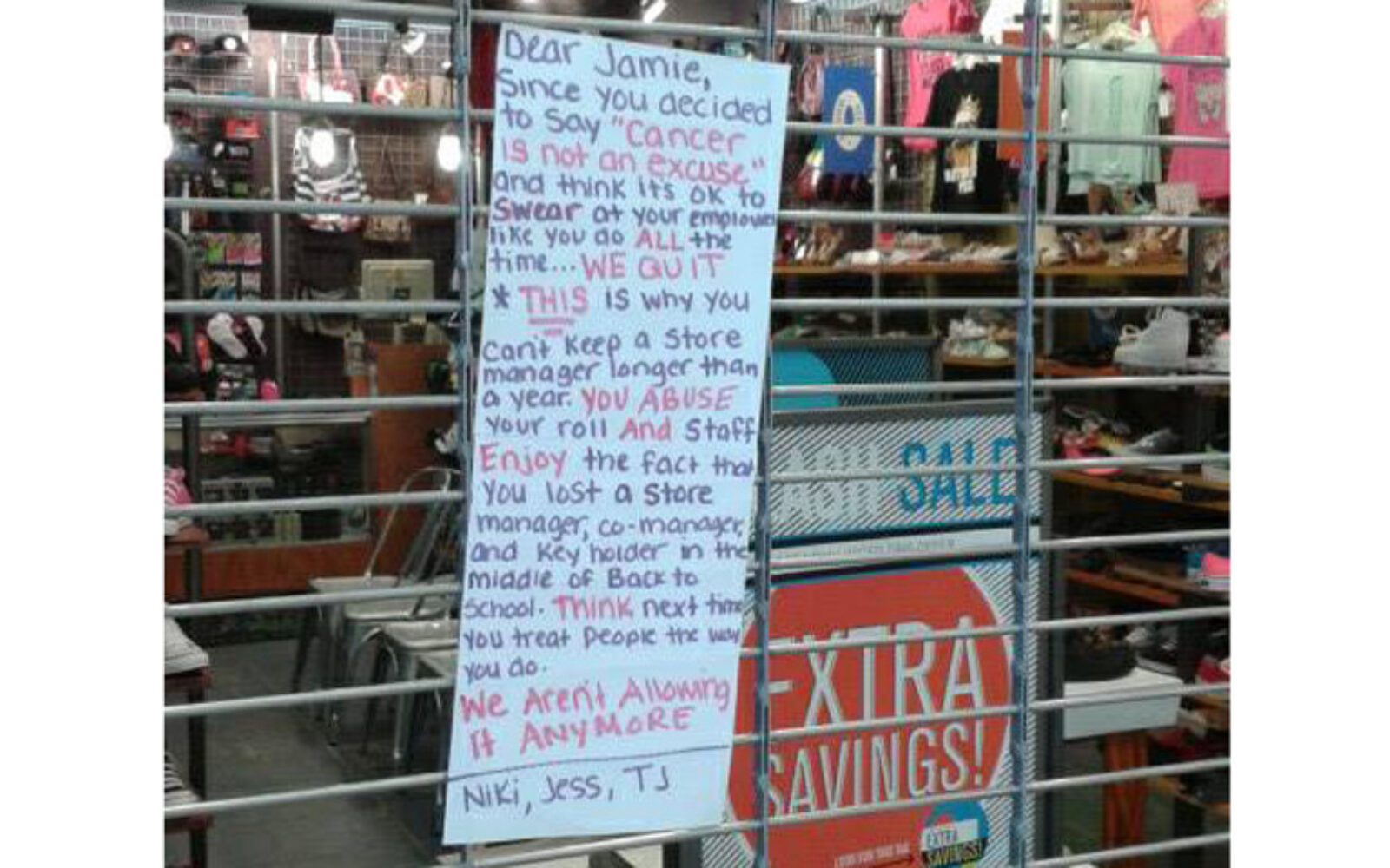 prekipjelo im Zatvorili trgovinu, a bezobraznom šefu ostavili poruku Troje zaposlenika u trgovini cipela Journeys u New Yorku dali su otkaz, zatvorili trgovinu i na ulazu ostavili ljutitu poruku svome šefu.