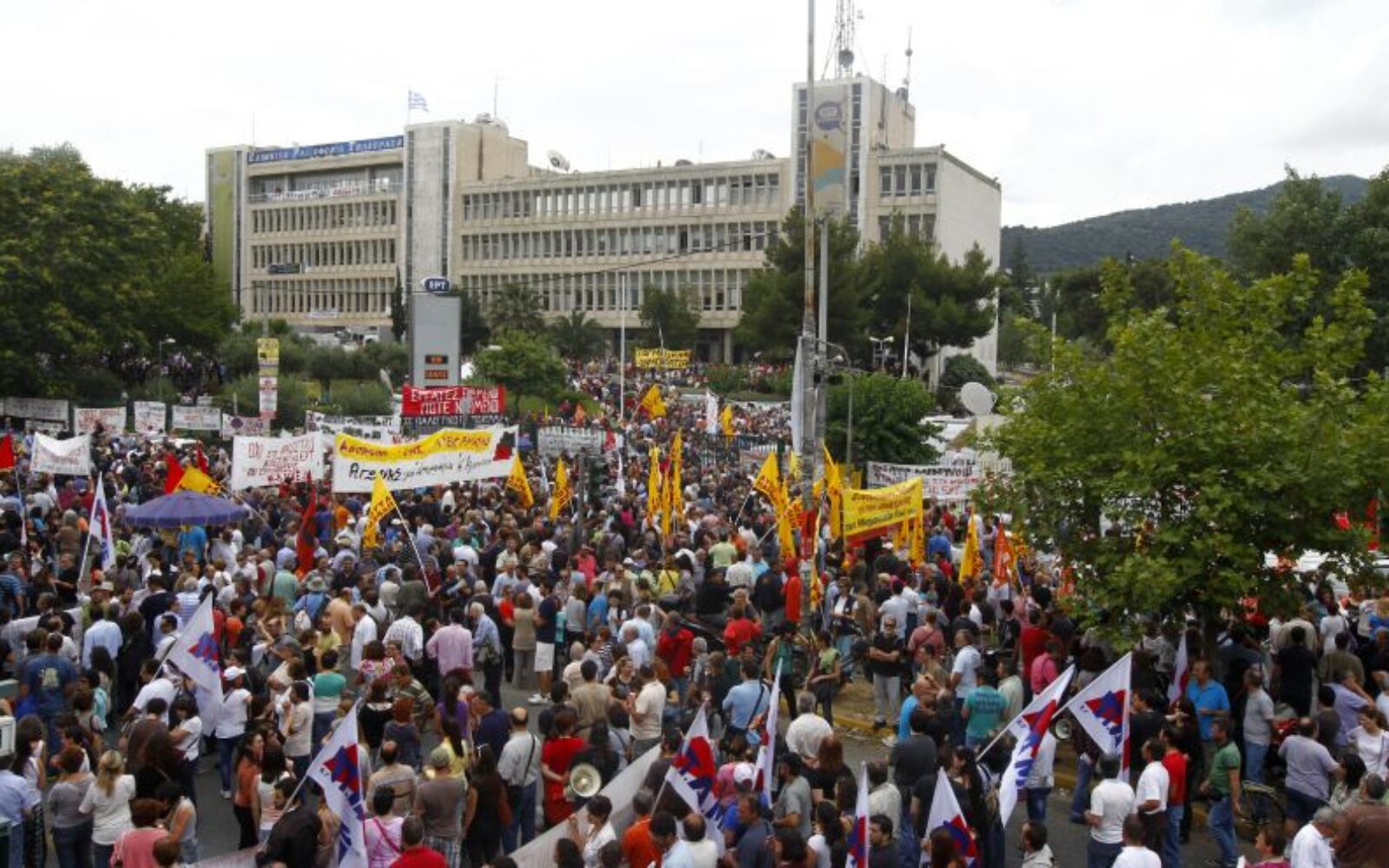 Opći štrajk U Grčkoj 12.000 prosvjednika protiv zatvaranja ERT-a U Ateni se gotovo 10.000 ljudi na poziv sindikata privatnog i javnog sektora, okupilo ispred zgrade ERT-a u Aghia Paraskevi