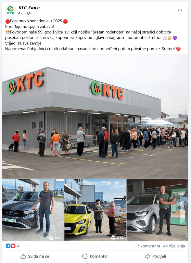 “Dragi kupci, obavještavamo vas o pojavi lažnih Facebook profila koji se predstavljaju kao KTC te objavljuju lažne nagradne igre u kojima navodno dijelimo 3 automobila. KTC d.d. nije povezan s takvim profilima niti s navedenim aktivnostima.